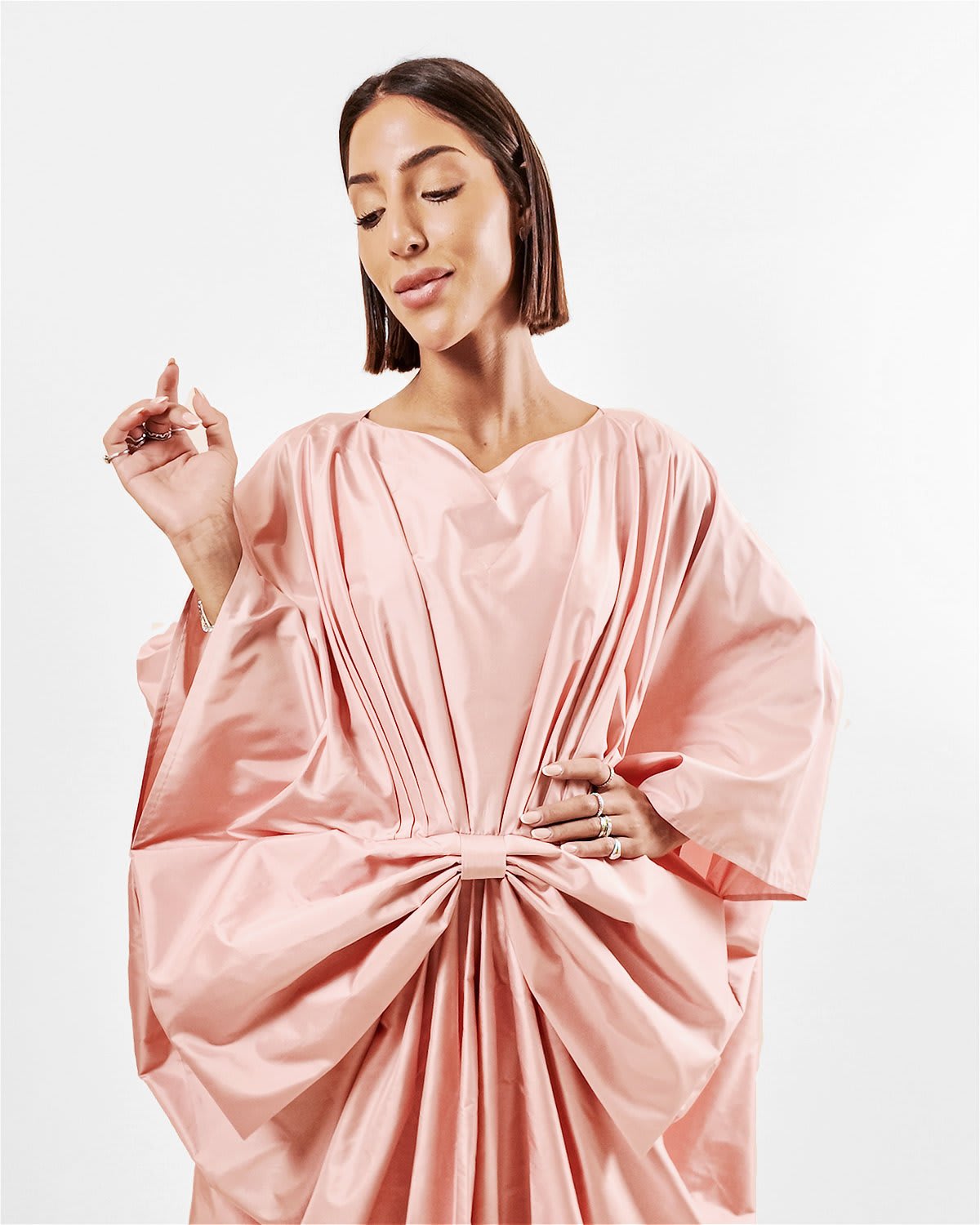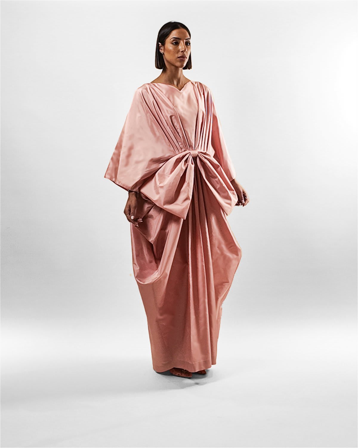Each Rosetta Silk Bow Kaftan is constructed individually in our Dubai atelier. Please allow 5–7 business days for dispatch. Every order is a commission.